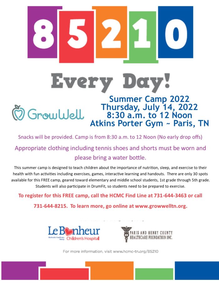 GrowWell TN and the Paris & Henry County Healthcare Foundation will be hosting a FREE summer day camp open to students who just completed 1st through 5th grades. The camp will be held on Thursday, July 14 from 8:30 a.m. until 12 noon at Atkins Porter Gym, located at 301 S. Highland in Paris, TN. The camp is designed to teach children about the importance of nutrition, sleep, and exercise to their health with exercise, games, interactive learning and handouts.